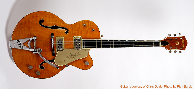 A primary feature change that signifies the ’60 model year is the 2.5” body and the adoption of the V-style Bigsby vibrato. Many examples of this model year have been found with highly figured (a.k.a. flamed) maple tops, backs and sides. The 60’ 6120 is essentially a 2.5” thick version of the 59’. A fine guitar. Brian Setzer owns and tours with several ’60 model year 6120’s.
