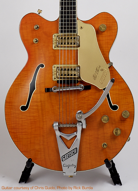 Drastically re-designed for the ’62 model year, the 6120 Chet Atkins Hollowbody incorporated what the Company marketed as the “Electrotone” (sealed-top) body, with a double-cutaway, string mute system, and padded back (covering an access door), as standard equipment. The 6120 model designation was finally decommissioned in 1972.
